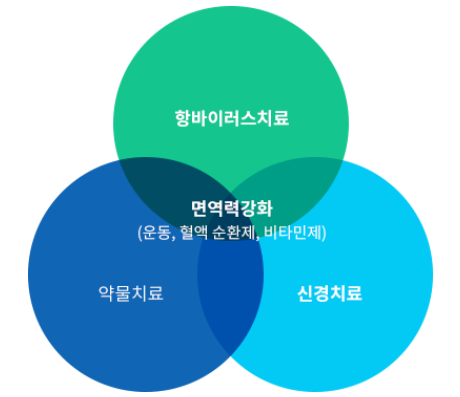대상포진 치료는 항바이러스 치료와 통증, 피부염증 , 기저질환에 따른 완화에 필요한 약물치료 그리고 신경치료와 더불어 빠른 회복을 위해 면역력 강화가 모두 병행이 되어야 한다.
